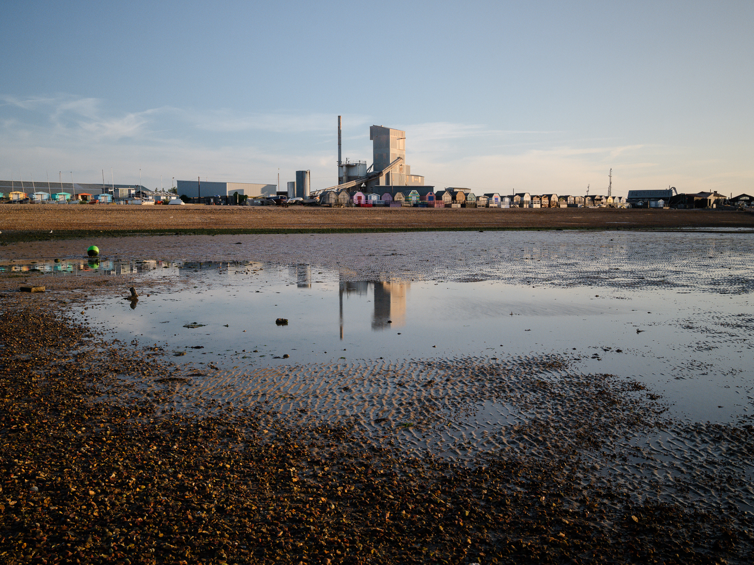 Whitstable Harbour, on the North Kent coast, attracts me by its compact scale and the uneasy coexistence of industry and leisure. The imposing cement works and oyster company sit alongside fishing boats and pleasure craft, while just along the quay, seafood restaurants, lively bars, and the famously expensive beach huts line the shore. I’m drawn to making images here that explore these competing forces.